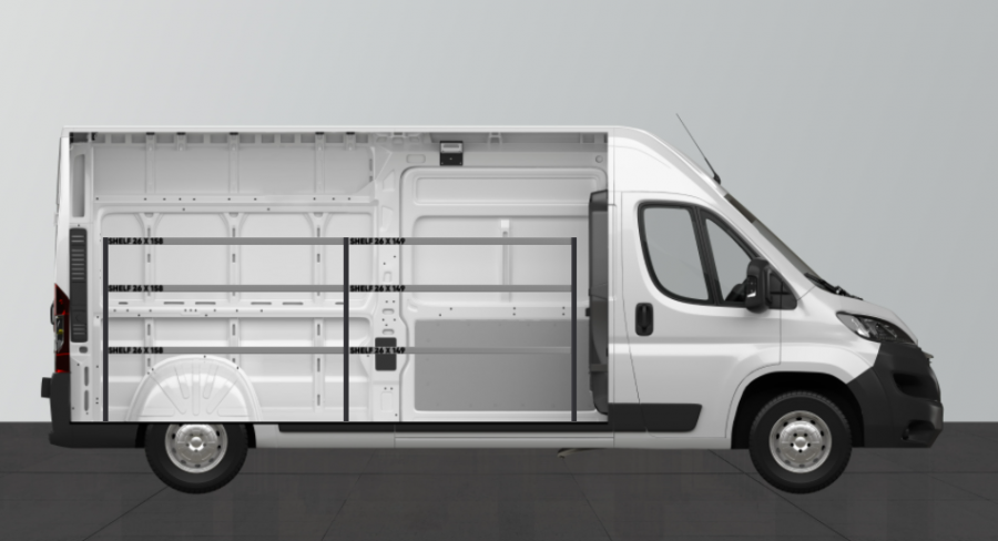 Cet aménagement utilitaire est particulièrement populaire pour ceux qui souhaitent garder un espace de chargement maximal dans leur Proace Max, Peugeot Boxer, Fiat Ducato & Citroën Jumper L3H2. Ce rangement utilitaire fait 262,5mm de profondeur et offre une bonne solution de rangement d’appoint. Il est possible de compléter cet aménagement avec notre nouveau système de bacs de rangement et de compléter les panneaux latéraux avec des smartbox afin de maximiser l’espace de stockage et de rangement.