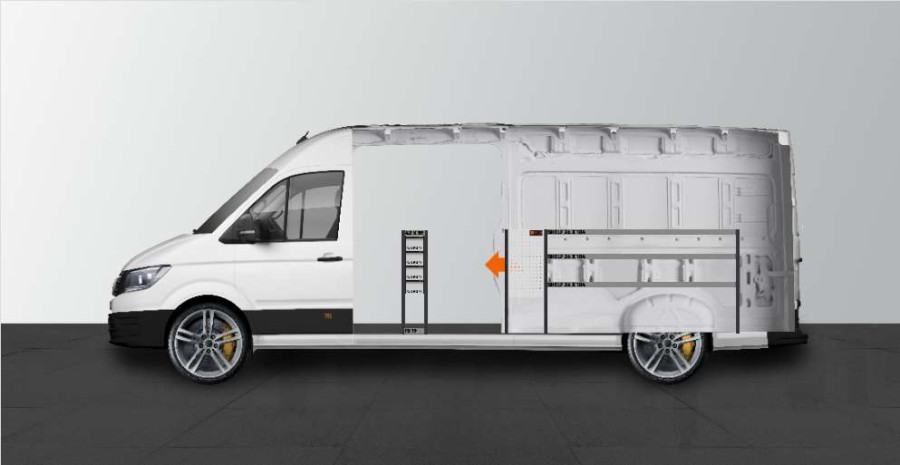 Voulez vous optimiser votre MAN TGE & Volkswagen Crafter L4 avec un aménagement supplémentaire ? Cet aménagement utilitaire vous permet de compléter votre espace de rangement tout en gardant un espace de chargement central maximal, grâce sa faible profondeur de seulement 260 mm. L’aménagement dispose de trois tiroirs de différentes tailles afin de varier les possibilités de rangement. Les tiroirs s’ouvrent facilement depuis la porte latérale coulissante et peuvent supporter une charge uniforme de 35 kg / tiroir. L’espace étagère derrière le bloc tiroir est idéal pour ranger vos mallettes, outils ou consommables mais peut aussi se compléter avec notre système de bacs de rangement sur rails.
