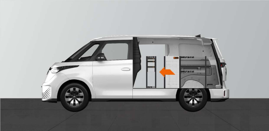 Voulez vous optimiser votre VOLKSWAGEN ID BUZZ L1 avec un aménagement supplémentaire ? Cet aménagement utilitaire vous permet de compléter votre espace de rangement tout en gardant un espace de chargement central maximal, grâce sa faible profondeur de seulement 260 mm. L’aménagement dispose de 4 tiroirs de différentes tailles afin de varier les possibilités de rangement. Les tiroirs s’ouvrent facilement depuis la porte latérale coulissante et peuvent supporter une charge uniforme de 35 kg / tiroir. L’espace étagère derrière le bloc tiroir est idéal pour ranger vos mallettes, outils ou consommables mais peut aussi se compléter avec notre système de bacs de rangement sur rails.