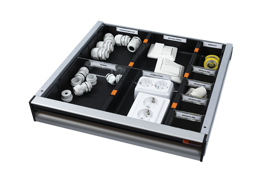 Nos inserts tiroirs sont très pratiques pour ranger les petits articles et accessoires d’outillage. Les inserts peuvent être montés dans tous nos tiroirs. Ils peuvent être complétés par des séparateurs pour créer plusieurs compartiments de différentes tailles. Les inserts et séparateurs peuvent chacun être assortis d’un porte-étiquette pour optimiser le rangement de votre utilitaire. Ils sont disponibles en deux hauteurs de 52,5mm et 105mm, et en quatre largeurs de 70mm, 80mm, 105mm et 160mm. Ils sont fabriqués en polypropylène recyclé.