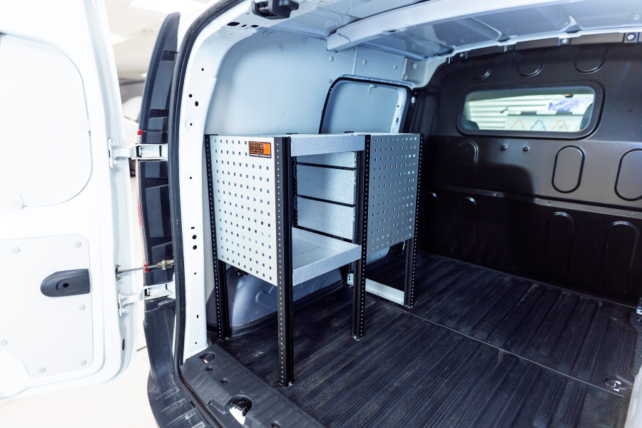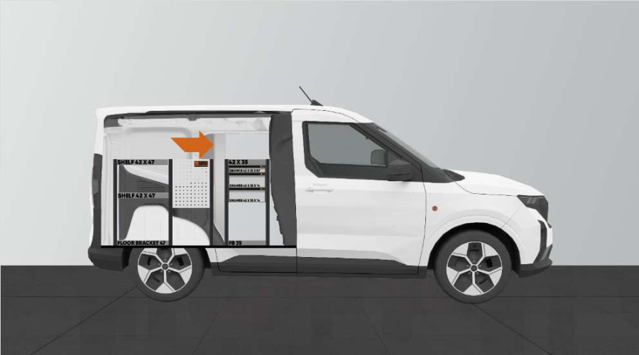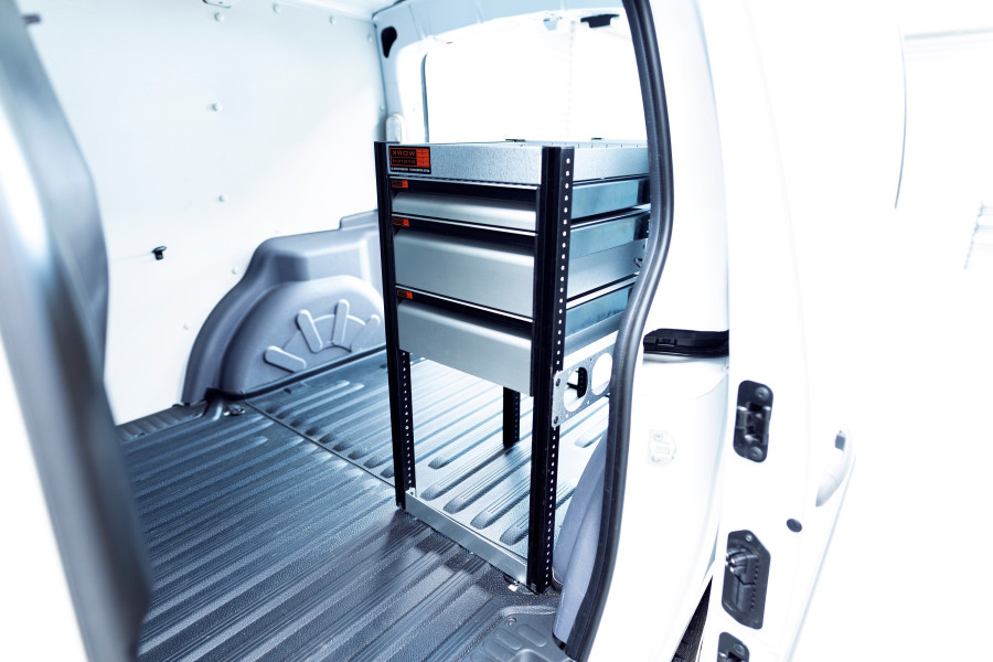 L'un des aménagements les plus populaires pour votre Ford Courier L1. L’aménagement avec une profondeur de 420 mm dispose de trois tiroirs de différentes tailles afin de varier les possibilités de rangement. Les tiroirs s’ouvrent facilement depuis la porte latérale coulissante et peuvent supporter une charge uniforme de 35 kg / tiroir. L’espace étagère derrière le bloc tiroir est idéal pour ranger vos mallettes, outils ou consommables mais peut aussi se compléter avec notre système de bacs de rangement sur rails