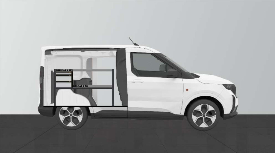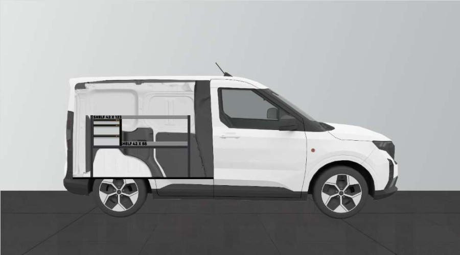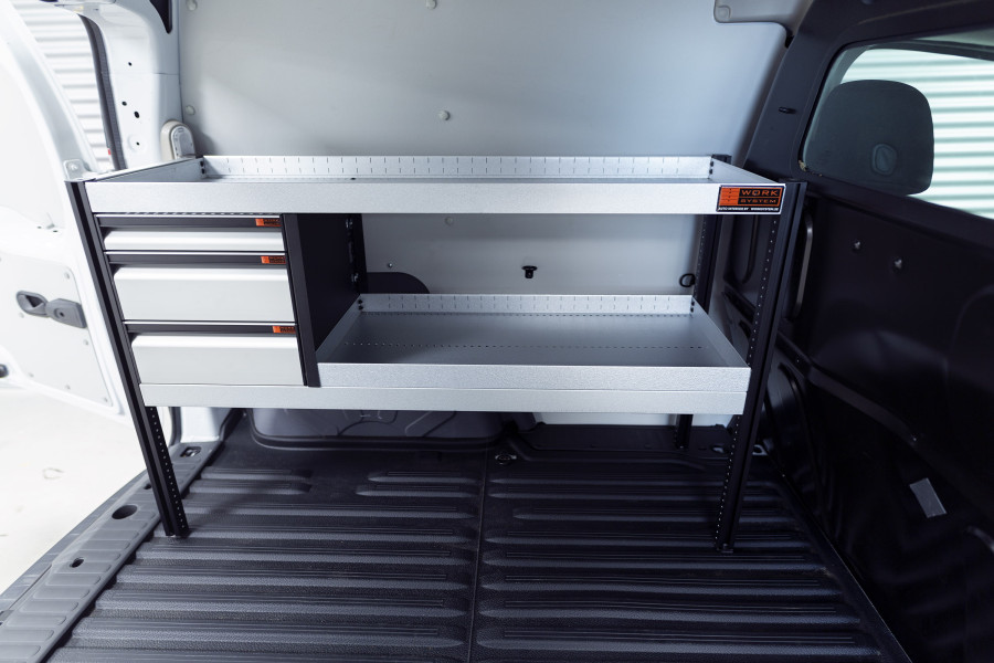 Une solution économique pour ceux qui recherchent un aménagement combinant tiroirs avec glissières à billes et étagères pour leur Ford Courier L1. Les étagères de 420 mm de profondeur permettent d’accueillir parfaitement la plupart des mallettes à outils actuellement disponibles sur le marché. Les tiroirs peuvent être complétés par nos inserts à tiroir qui permettent de bien ranger les petits objets.
