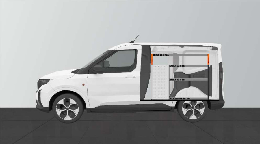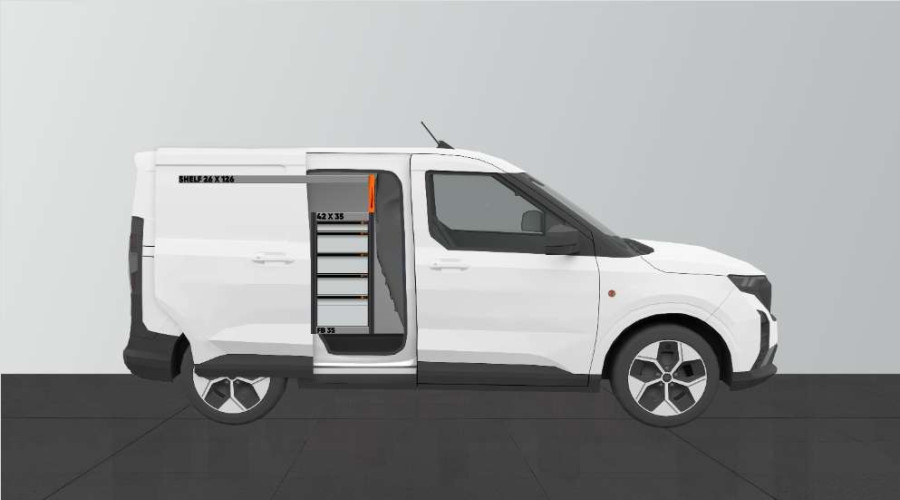Cet aménagement offre un grand espace de rangement (tiroirs et étagères) pour Ford Courier L1 avec porte latérale gauche.