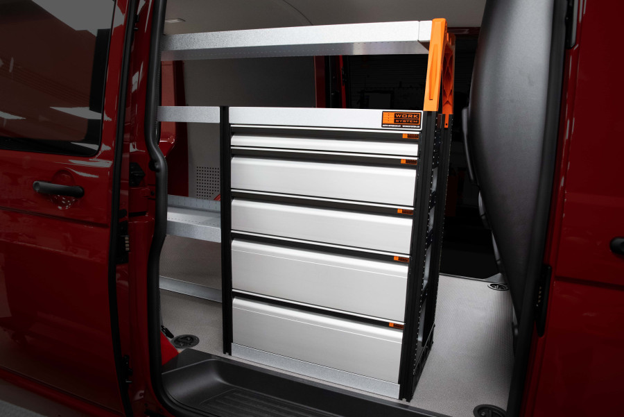 Voici l’un de nos systèmes les plus appréciés des conducteurs de Ford Courier L1. Le chiffre 5 correspond au nombre de tiroirs. Cet aménagement offre également d’excellentes possibilités de rangement dans les étagères, non seulement pour vos mallettes à outils et vos outils électriques mais aussi pour vos petits objets. Vous disposez d’un bloc à tiroirs qui est tourné vers l’ouverture de la porte latérale. À l’arrière du bloc à tiroirs se trouve un panneau perforé pour augmenter les possibilités d’accrocher du matériel. Les tiroirs avec roulement à billes peuvent être complétés par nos inserts à tiroir pour structurer l’espace de façon optimale. Le panneau perforé peut être équipé de nos accessoires Smartbox, crochets, etc. afin d’optimiser votre espace de rangement.