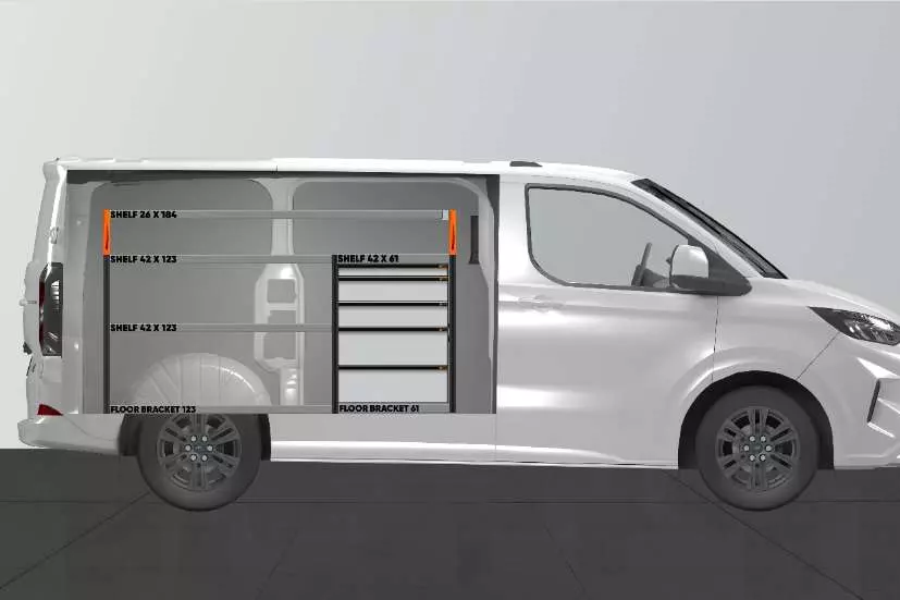 Cet aménagement offre un grand espace de rangement (tiroirs et étagères) pour Ford Custom & VW Transporter L1 avec porte latérale gauche.