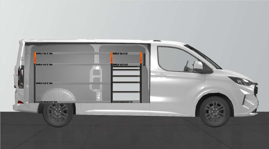 Voici l’un de nos systèmes les plus appréciés des conducteurs de Ford Custom & VW Transporter L2. Le chiffre 5 correspond au nombre de tiroirs. Cet aménagement offre également d’excellentes possibilités de rangement dans les étagères, non seulement pour vos mallettes à outils et vos outils électriques mais aussi pour vos petits objets. Vous disposez d’un caisson à tiroirs de tailles différentes pour que chaque article trouve sa place. Les tiroirs avec roulement à billes peuvent être complétés par nos inserts à tiroir pour structurer l’espace de façon optimale. Le panneau perforé peut être équipé de nos accessoires Smartbox, crochets, etc. afin d’optimiser votre espace de rangement.