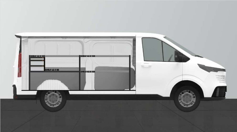 Une solution d’aménagement simple avec tiroirs et étagères pour MAXUS E-DELIVER 7 très populaire auprès des conducteurs de véhicule de maintenance.