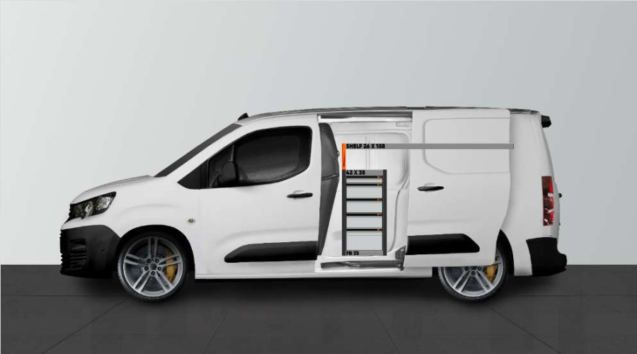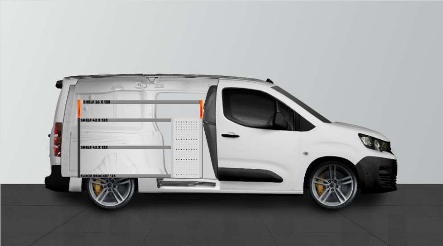 Cet aménagement offre un grand espace de rangement (tiroirs et étagères) pour Berlingo, Combo, Doblo Proace City & Partner L2 avec porte latérale gauche.