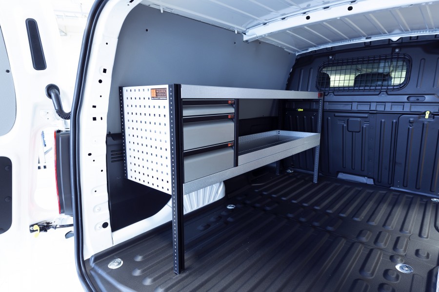 Une solution économique pour ceux qui recherchent un aménagement combinant tiroirs avec glissières à billes et étagères pour leur Citroën Berlingo, Opel Combo, Fiat Doblo Toyota Proace City & Peugeot Partner L2. Les étagères de 420 mm de profondeur permettent d’accueillir parfaitement la plupart des mallettes à outils actuellement disponibles sur le marché. Les tiroirs peuvent être complétés par nos inserts à tiroir qui permettent de bien ranger les petits objets.