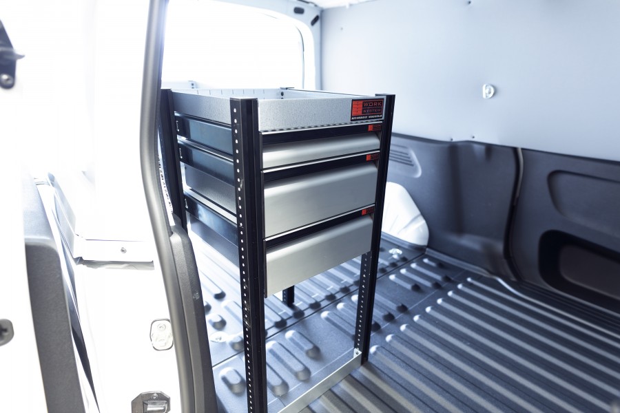 L'un des aménagements les plus populaires pour votre Citroën Berlingo, Opel Combo, Fiat Doblo Toyota Proace City & Peugeot Partner L2. L’aménagement avec une profondeur de 420 mm dispose de trois tiroirs de différentes tailles afin de varier les possibilités de rangement. Les tiroirs s’ouvrent facilement depuis la porte latérale coulissante et peuvent supporter une charge uniforme de 35 kg / tiroir. L’espace étagère derrière le bloc tiroir est idéal pour ranger vos mallettes, outils ou consommables mais peut aussi se compléter avec notre système de bacs de rangement sur rails