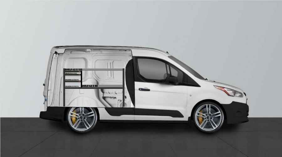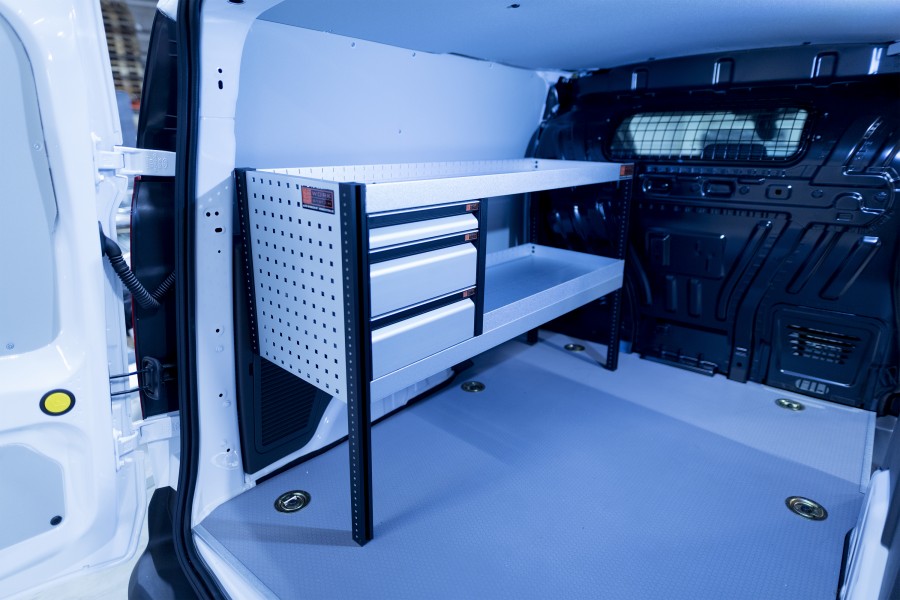 Une solution économique pour ceux qui recherchent un aménagement combinant tiroirs avec glissières à billes et étagères pour leur Ford Connect L1. Les étagères de 420 mm de profondeur permettent d’accueillir parfaitement la plupart des mallettes à outils actuellement disponibles sur le marché. Les tiroirs peuvent être complétés par nos inserts à tiroir qui permettent de bien ranger les petits objets.