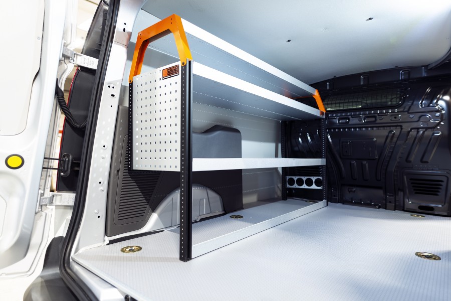 Avec une profondeur de 420 mm, cet aménagement offre d’excellentes possibilités de rangement pour votre Ford Connect L2. Les étagères de 420 mm de profondeur permettent d’accueillir parfaitement la plupart des mallettes à outils actuellement disponibles sur le marché. L’étagère du haut de 262,5 mm est souvent combinée à nos bacs modulaires pour y ranger les petits objets. L’aménagement est adapté aux véhicules avec ou sans porte latérale et le panneau perforé latéral peut être équipé de nos accessoires Smartbox, crochets, etc.