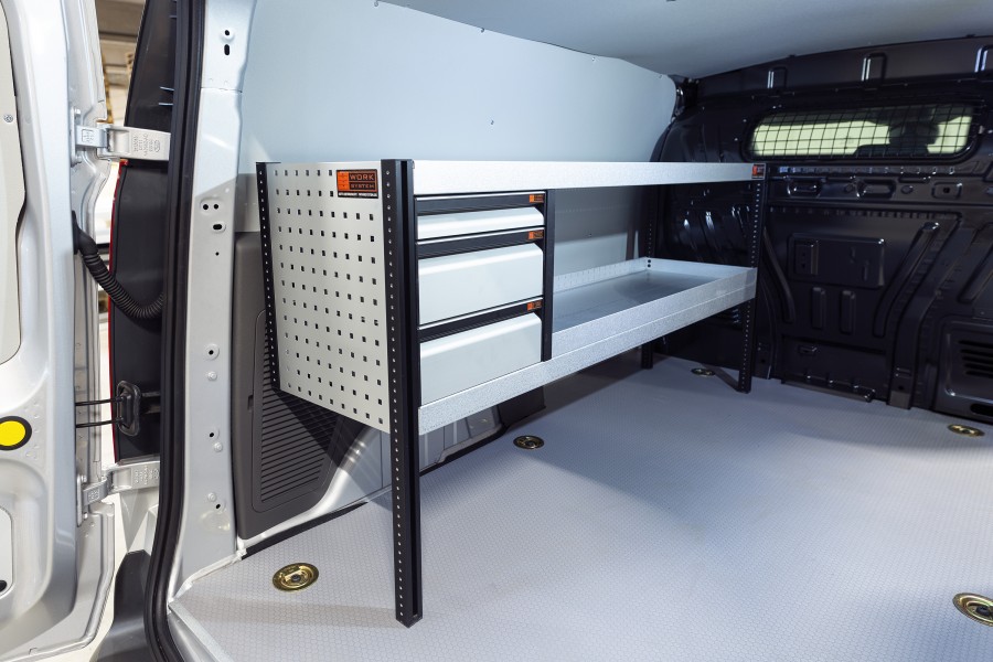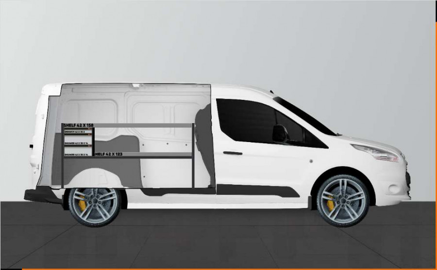Une solution d’aménagement simple avec tiroirs et étagères pour Ford Connect L2 très populaire auprès des conducteurs de véhicule de maintenance.