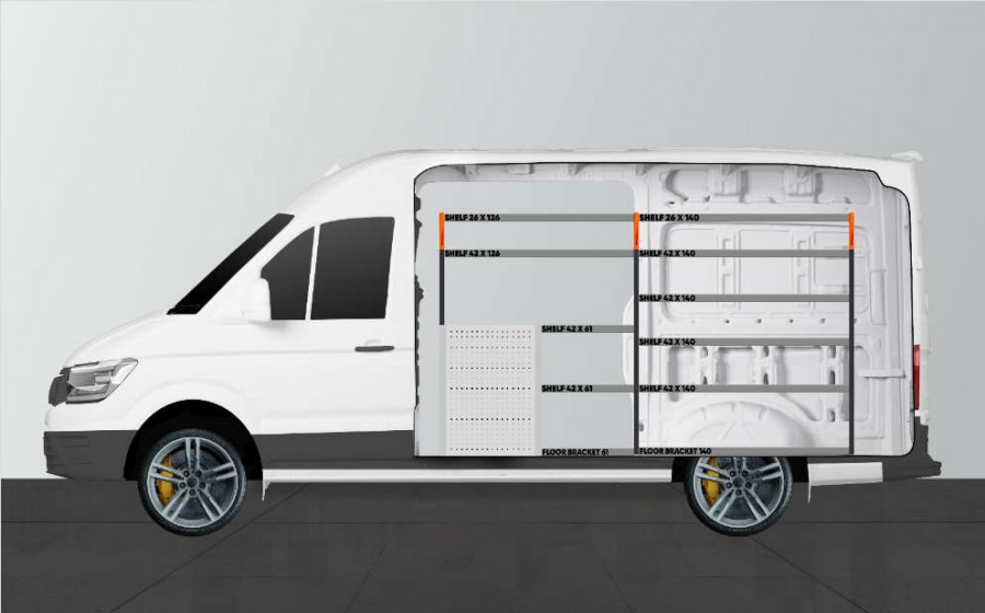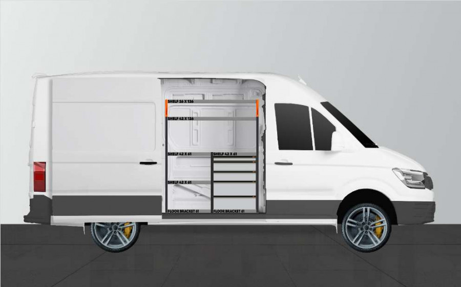 Voici l’un de nos systèmes les plus appréciés des conducteurs de MAN TGE & Volkswagen Crafter L3. Le chiffre 5 correspond au nombre de tiroirs. Cet aménagement offre également d’excellentes possibilités de rangement dans les étagères, non seulement pour vos mallettes à outils et vos outils électriques mais aussi pour vos petits objets. Vous disposez d’un bloc à tiroirs qui est tourné vers l’ouverture de la porte latérale. À l’arrière du bloc à tiroirs se trouve un panneau perforé pour augmenter les possibilités d’accrocher du matériel. Les tiroirs avec roulement à billes peuvent être complétés par nos inserts à tiroir pour structurer l’espace de façon optimale. Le panneau perforé peut être équipé de nos accessoires Smartbox, crochets, etc. afin d’optimiser votre espace de rangement.