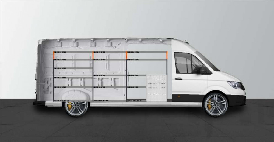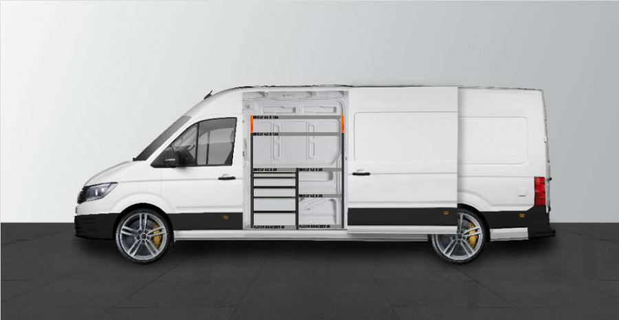 Cet aménagement offre un grand espace de rangement (tiroirs et étagères) pour Man TGE & VW Crafter L4 avec porte latérale gauche. (Retour/échange exclus)