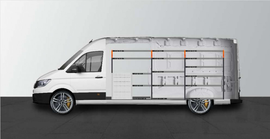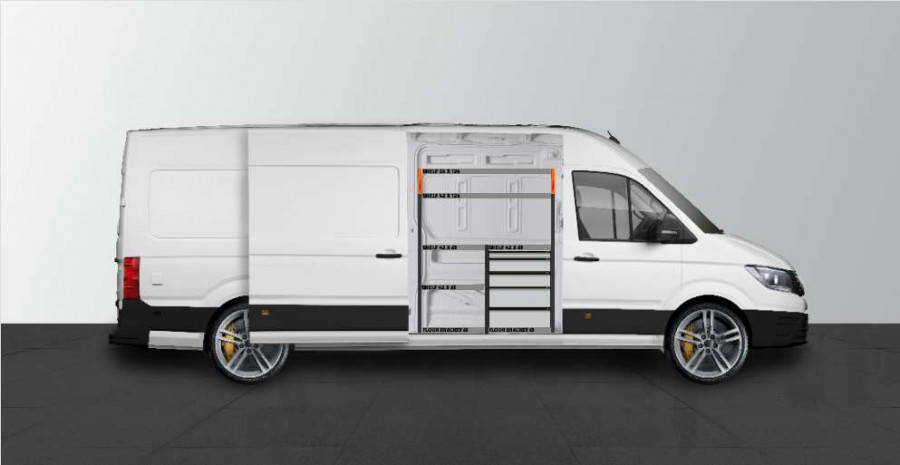 Voici l’un de nos systèmes les plus appréciés des conducteurs de MAN TGE & Volkswagen Crafter L4. Le chiffre 5 correspond au nombre de tiroirs. Cet aménagement offre également d’excellentes possibilités de rangement dans les étagères, non seulement pour vos mallettes à outils et vos outils électriques mais aussi pour vos petits objets. Vous disposez d’un bloc à tiroirs qui est tourné vers l’ouverture de la porte latérale. À l’arrière du bloc à tiroirs se trouve un panneau perforé pour augmenter les possibilités d’accrocher du matériel. Les tiroirs avec roulement à billes peuvent être complétés par nos inserts à tiroir pour structurer l’espace de façon optimale. Le panneau perforé peut être équipé de nos accessoires Smartbox, crochets, etc. afin d’optimiser votre espace de rangement.