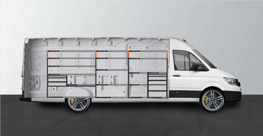 Aménagement utilitaire équipé de nombreux tiroirs, offrant un grand espace de rangement pour Man TGE & VW Crafter L5.