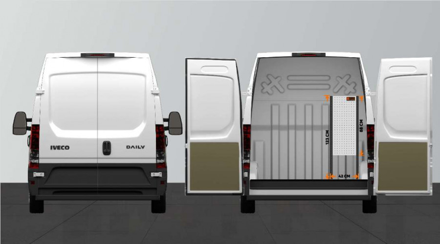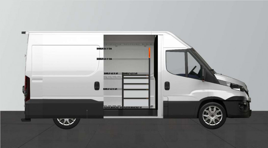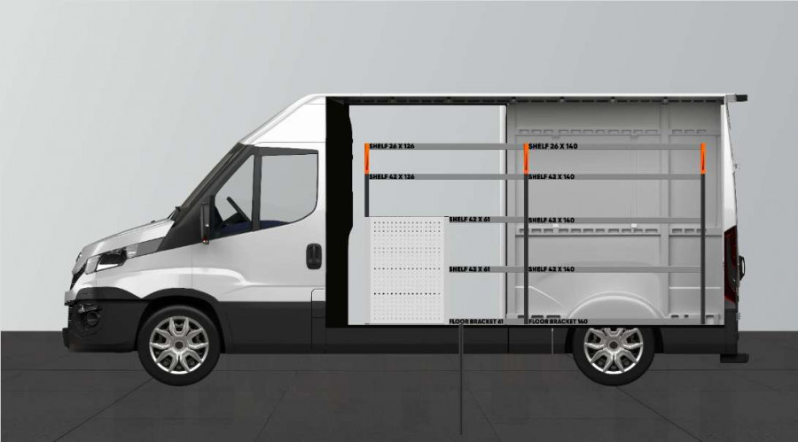 Voici l’un de nos systèmes les plus appréciés des conducteurs de Iveco Daily L2. Le chiffre 5 correspond au nombre de tiroirs. Cet aménagement offre également d’excellentes possibilités de rangement dans les étagères, non seulement pour vos mallettes à outils et vos outils électriques mais aussi pour vos petits objets. Vous disposez d’un bloc à tiroirs qui est tourné vers l’ouverture de la porte latérale. À l’arrière du bloc à tiroirs se trouve un panneau perforé pour augmenter les possibilités d’accrocher du matériel. Les tiroirs avec roulement à billes peuvent être complétés par nos inserts à tiroir pour structurer l’espace de façon optimale. Le panneau perforé peut être équipé de nos accessoires Smartbox, crochets, etc. afin d’optimiser votre espace de rangement.