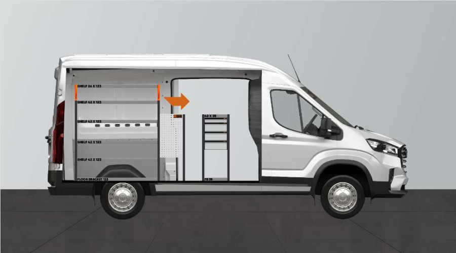 L'un des aménagements les plus populaires pour votre Maxus e-Deliver 9 L2. L’aménagement avec une profondeur de 420 mm dispose de trois tiroirs de différentes tailles afin de varier les possibilités de rangement. Les tiroirs s’ouvrent facilement depuis la porte latérale coulissante et peuvent supporter une charge uniforme de 35 kg / tiroir. L’espace étagère derrière le bloc tiroir est idéal pour ranger vos mallettes, outils ou consommables mais peut aussi se compléter avec notre système de bacs de rangement sur rails