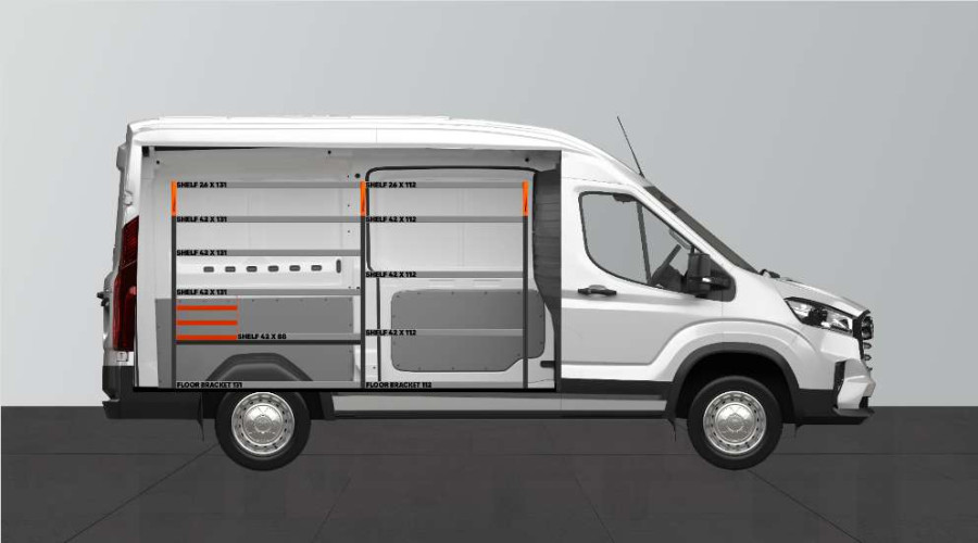 Un aménagement utilitaire idéal pour ceux qui recherchent une solution de rangement polyvalente pour mallettes portatives et machines. Cette étagère comprend trois supports pour mallettes spécifiquement conçu pour nos mallettes de taille moyenne Raaco Carrylight. Nous proposons les mallettes en option. Aménagement utilitaire parfaitement adapté à votre Maxus e-Deliver 9 L2.