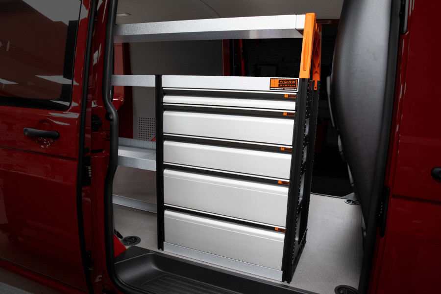 Voici l’un de nos systèmes les plus appréciés des conducteurs de Peugeot Expert, Citroen Jumpy, Opel Vivaro, Fiat Scudo & Toyota ProAce. Le chiffre 5 correspond au nombre de tiroirs. Cet aménagement offre également d’excellentes possibilités de rangement dans les étagères, non seulement pour vos mallettes à outils et vos outils électriques mais aussi pour vos petits objets. Vous disposez d’un caisson à tiroirs de tailles différentes pour que chaque article trouve sa place. Les tiroirs avec roulement à billes peuvent être complétés par nos inserts à tiroir pour structurer l’espace de façon optimale. Le panneau perforé peut être équipé de nos accessoires Smartbox, crochets, etc. afin d’optimiser votre espace de rangement.