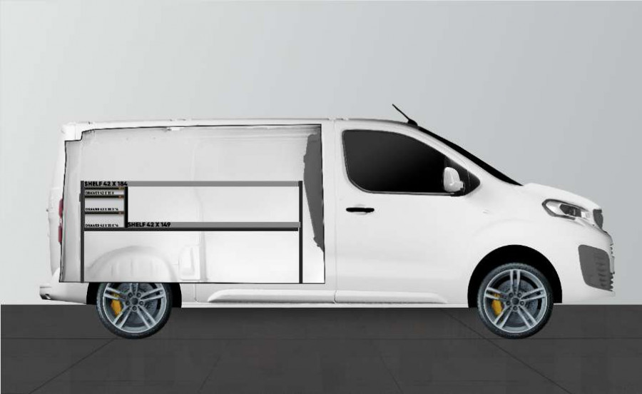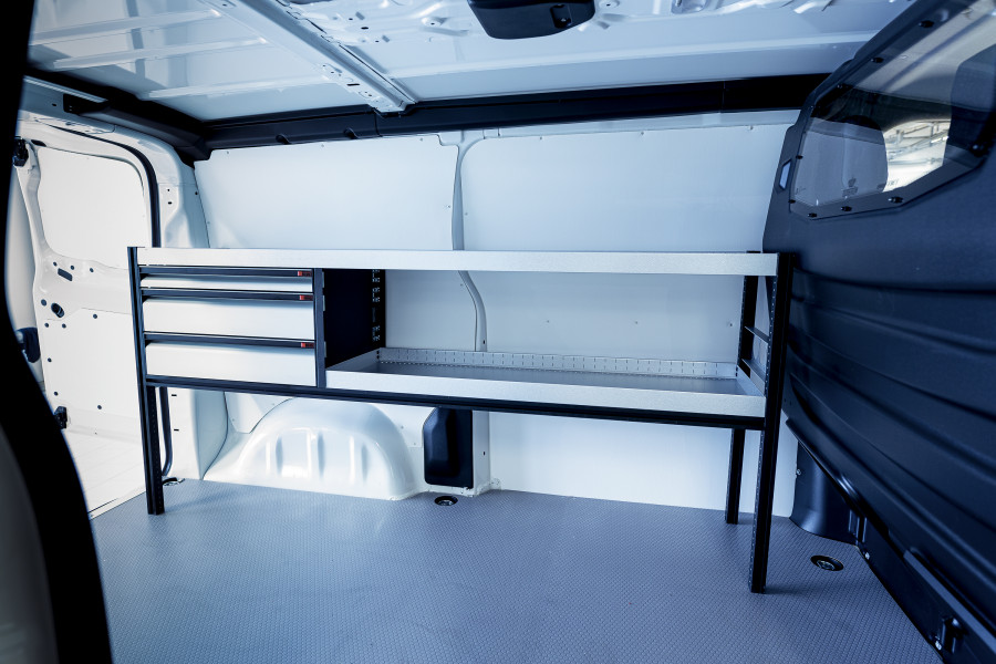 Une solution économique pour ceux qui recherchent un aménagement combinant tiroirs avec glissières à billes et étagères pour leur Peugeot Expert, Citroën Jumpy, Opel Vivaro, Fiat Scudo & Toyota ProAce L2. Les étagères de 420 mm de profondeur permettent d’accueillir parfaitement la plupart des mallettes à outils actuellement disponibles sur le marché. Les tiroirs peuvent être complétés par nos inserts à tiroir qui permettent de bien ranger les petits objets.