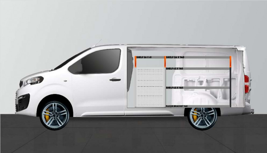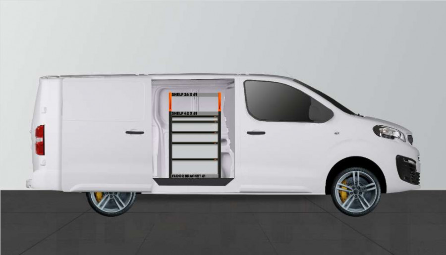 Voici l’un de nos systèmes les plus appréciés des conducteurs de Peugeot Expert, Citroen Jumpy, Opel Vivaro, Fiat Scudo & Toyota ProAce avec porte latérale gauche (côté conducteur). Le chiffre 5 correspond au nombre de tiroirs. Cet aménagement offre également d’excellentes possibilités de rangement dans les étagères, non seulement pour vos mallettes à outils et vos outils électriques mais aussi pour vos petits objets. Vous disposez d’un bloc à tiroirs qui est tourné vers l’ouverture de la porte latérale gauche. À l’arrière du bloc à tiroirs se trouve un panneau perforé pour augmenter les possibilités d’accrocher du matériel. Les tiroirs avec roulement à billes peuvent être complétés par nos inserts à tiroir pour structurer l’espace de façon optimale. Le panneau perforé peut être équipé de nos accessoires Smartbox, crochets, etc. afin d’optimiser votre espace de rangement.