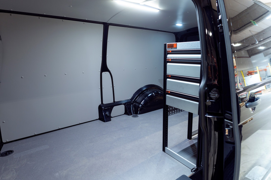 L'un des aménagements les plus populaires pour votre Opel Movano, Renault Master & Nissan NV400 L3. L’aménagement avec une profondeur de 420 mm dispose de trois tiroirs de différentes tailles afin de varier les possibilités de rangement. Les tiroirs s’ouvrent facilement depuis la porte latérale coulissante et peuvent supporter une charge uniforme de 50 kg / tiroir. L’espace étagère derrière le bloc tiroir est idéal pour ranger vos mallettes, outils ou consommables mais peut aussi se compléter avec notre système de bacs de rangement sur rails