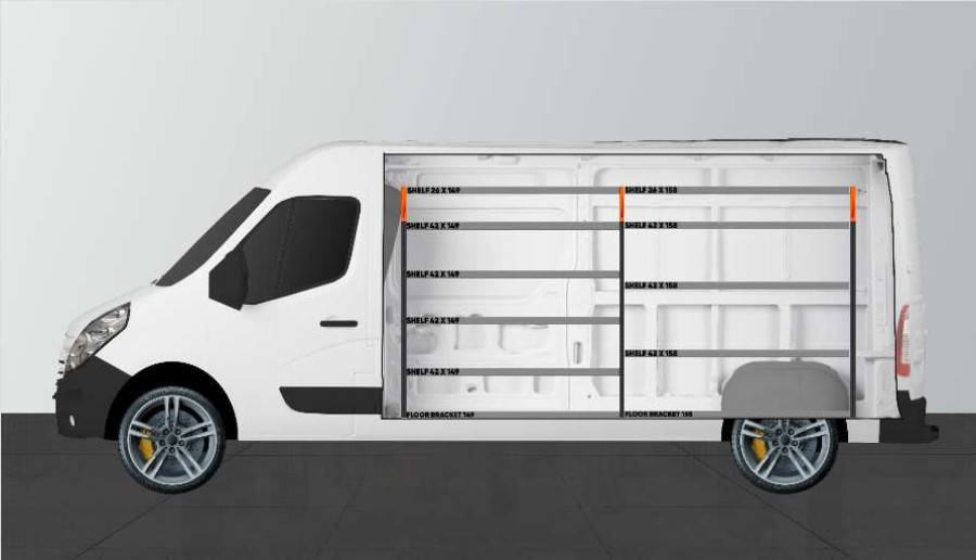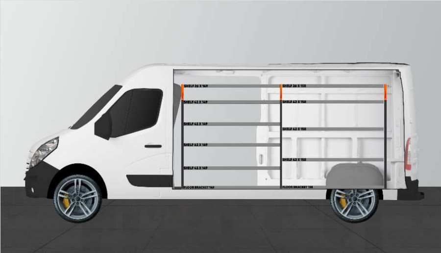 Avec une profondeur de 420 mm, cet aménagement offre d’excellentes possibilités de rangement pour votre Opel Movano, Renault Master & Nissan NV400 L3. Les étagères de 420 mm de profondeur permettent d’accueillir parfaitement la plupart des mallettes à outils actuellement disponibles sur le marché. L’étagère du haut de 262,5 mm est souvent combinée à nos bacs modulaires pour y ranger les petits objets. L’aménagement est adapté aux véhicules avec ou sans porte latérale et le panneau perforé latéral peut être équipé de nos accessoires Smartbox, crochets, etc.