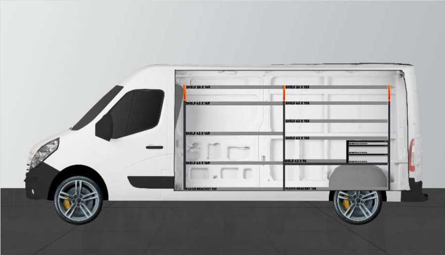 Voici l’un de nos aménagements utilitaires les plus appréciés des conducteurs de Opel Movano, Renault Master & Nissan NV400 L3. L’aménagement LS3 est utilisé tant par les professionnels du bâtiment que par les techniciens SAV, les électriciens, les plombiers, les chauffagistes et les menuisiers. L’aménagement offre d’excellentes possibilités de rangement pour les mallettes à outils, les machines, les consommables ainsi que pour les petits objets. Les tiroirs peuvent être complétés par nos inserts à tiroir et le panneau perforé latéral peut être équipé de nos accessoires Smartbox, crochets, etc.