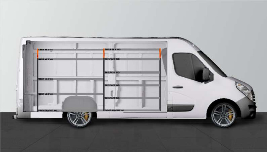 Avec une profondeur de 420 mm, cet aménagement offre d’excellentes possibilités de rangement pour votre Opel Movano, Renault Master & Nissan NV400. Les étagères de 420 mm de profondeur permettent d’accueillir parfaitement la plupart des mallettes à outils actuellement disponibles sur le marché. L’étagère du haut de 262,5 mm est souvent combinée à nos bacs modulaires pour y ranger les petits objets. L’aménagement est adapté aux véhicules avec ou sans porte latérale et le panneau perforé latéral peut être équipé de nos accessoires Smartbox, crochets, etc.