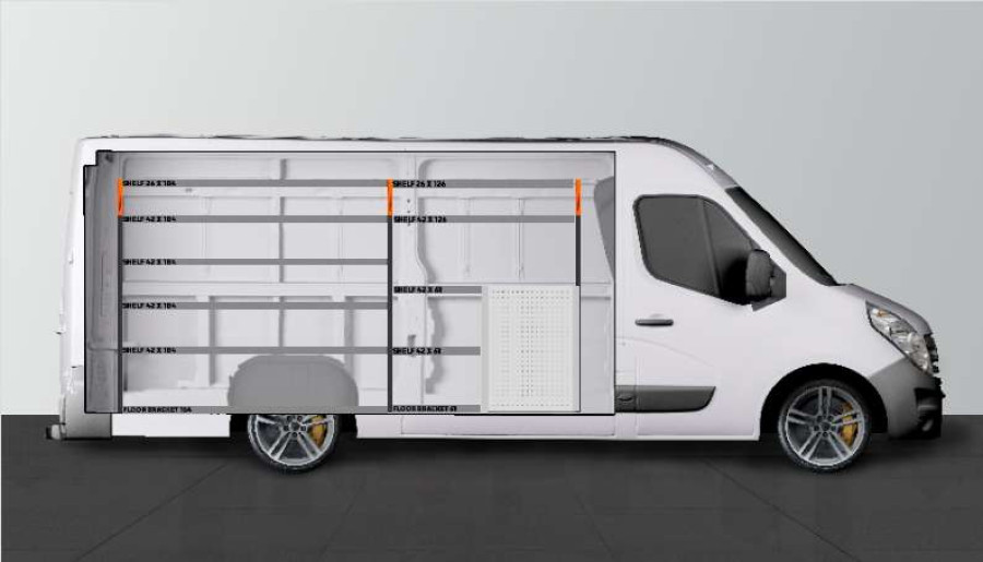 Cet aménagement offre un grand espace de rangement (tiroirs et étagères) pour Movano, Master & NV400 L3 avec porte latérale gauche. (Retour/échange exclus)