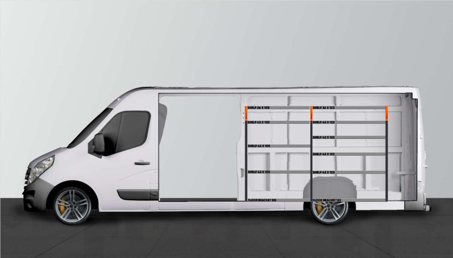 Un aménagement utilitaire pour Movano, Master et NV400 L4 H2 qui offre une bonne solution de rangement tant pour les mallettes d’outils et l’outillage électroportatif que pour les petites pièces. Cet aménagement, aux rayonnages de 420 mm de profondeur, permet d’accueillir parfaitement la plupart des mallettes d’outils actuellement disponibles sur le marché. En général, l’étagère du haut de 262,5 mm est complétée avec nos nouveaux bacs modulaires pour y ranger les petites pièces. Surtout, profitez bien du tableau à outils sur le panneau latéral.