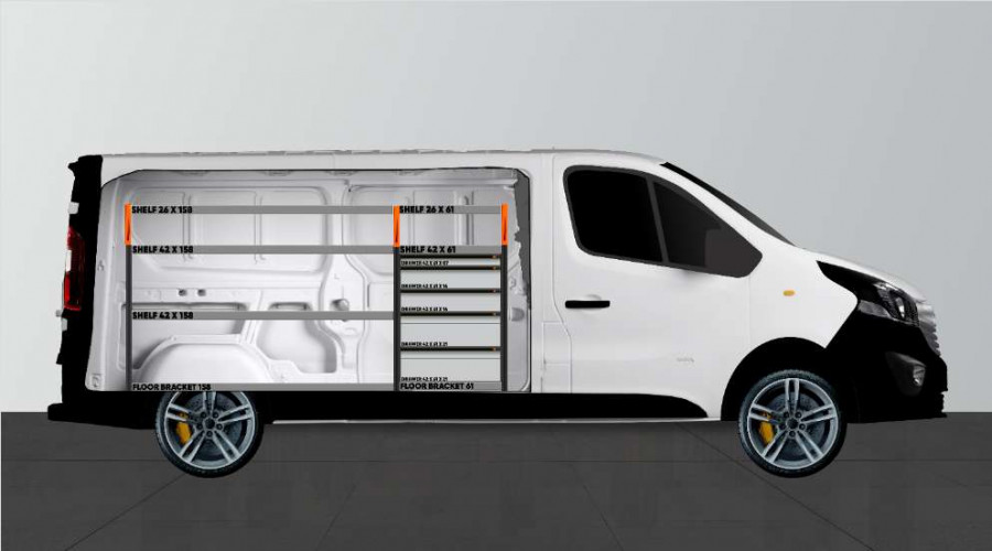 Cet aménagement offre un grand espace de rangement (tiroirs et étagères) pour Talento, NV300 & Trafic L2avec porte latérale gauche.