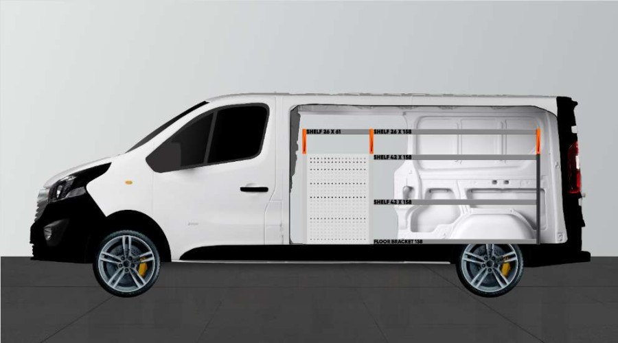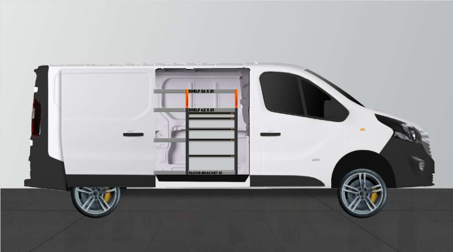 Voici l’un de nos systèmes les plus appréciés des conducteurs de Nissan NV300, Renault Trafic & Fiat Talento L2. Le chiffre 5 correspond au nombre de tiroirs. Cet aménagement offre également d’excellentes possibilités de rangement dans les étagères, non seulement pour vos mallettes à outils et vos outils électriques mais aussi pour vos petits objets. Vous disposez d’un bloc à tiroirs qui est tourné vers l’ouverture de la porte latérale. À l’arrière du bloc à tiroirs se trouve un panneau perforé pour augmenter les possibilités d’accrocher du matériel. Les tiroirs avec roulement à billes peuvent être complétés par nos inserts à tiroir pour structurer l’espace de façon optimale. Le panneau perforé peut être équipé de nos accessoires Smartbox, crochets, etc. afin d’optimiser votre espace de rangement.