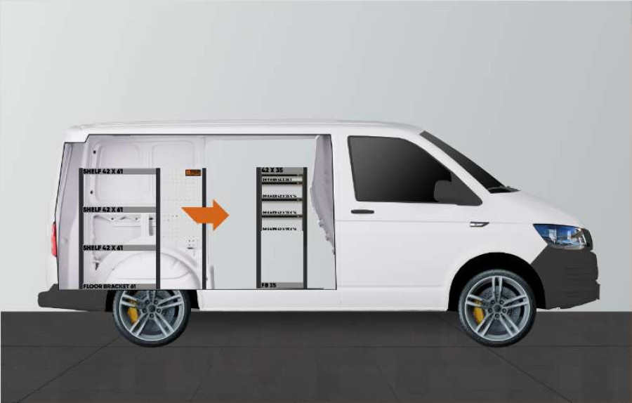 L'un des aménagements les plus populaires pour votre Volkswagen Transporter L1. L’aménagement avec une profondeur de 420 mm dispose de trois tiroirs de différentes tailles afin de varier les possibilités de rangement. Les tiroirs s’ouvrent facilement depuis la porte latérale coulissante et peuvent supporter une charge uniforme de 35 kg / tiroir. L’espace étagère derrière le bloc tiroir est idéal pour ranger vos mallettes, outils ou consommables mais peut aussi se compléter avec notre système de bacs de rangement sur rails