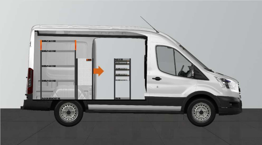 L'un des aménagements les plus populaires pour votre Ford Transit L2H2. L’aménagement avec une profondeur de 420 mm dispose de trois tiroirs de différentes tailles afin de varier les possibilités de rangement. Les tiroirs s’ouvrent facilement depuis la porte latérale coulissante et peuvent supporter une charge uniforme de 35 kg / tiroir. L’espace étagère derrière le bloc tiroir est idéal pour ranger vos mallettes, outils ou consommables mais peut aussi se compléter avec notre système de bacs de rangement sur rails