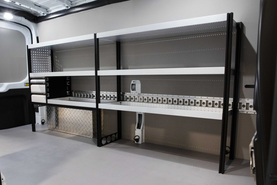 Une solution d’aménagement simple avec tiroirs et étagères pour Ford Transit L2H2très populaire auprès des conducteurs de véhicule de maintenance.