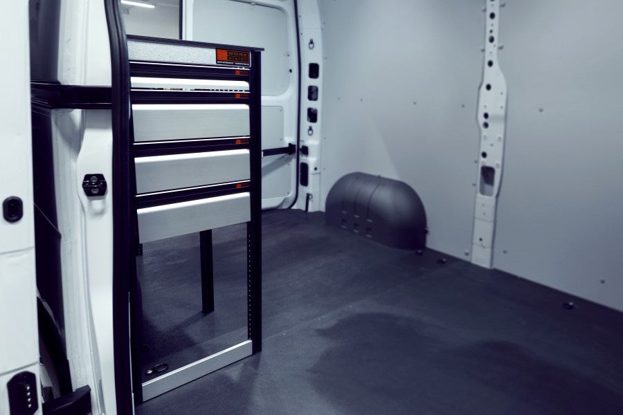 Si vous avez besoin d’un établi dans votre FORD TRANSIT L3H2, cet aménagement flexible qui combine étagères et tiroirs accessibles facilement depuis la porte latérale du véhicule est fait pour vous. L’établi en stratifié compact de 12 mm est très solide et résistant.