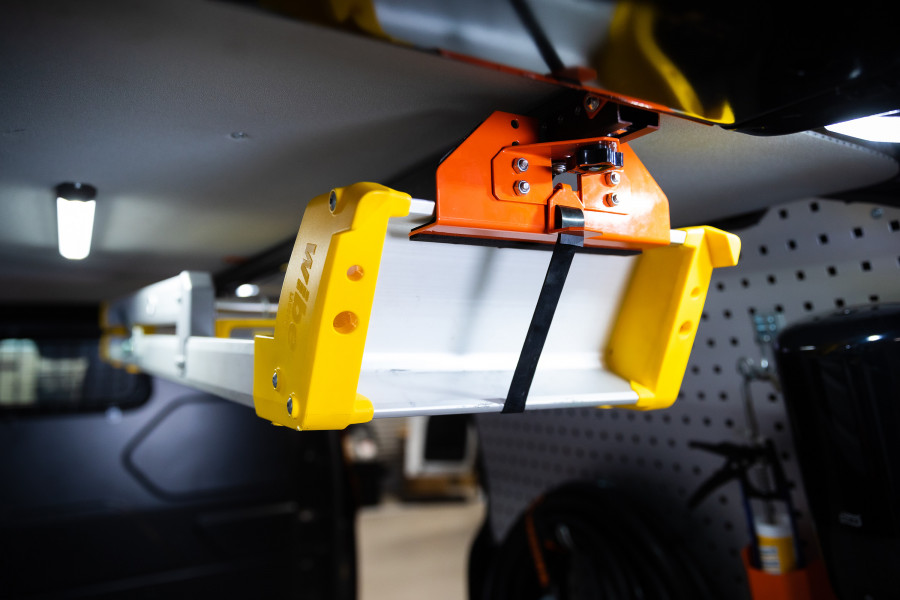 Redoublez d’efficacité en rangeant votre échelle au plafond de votre véhicule grâce à ce porte-échelle à ressort.
