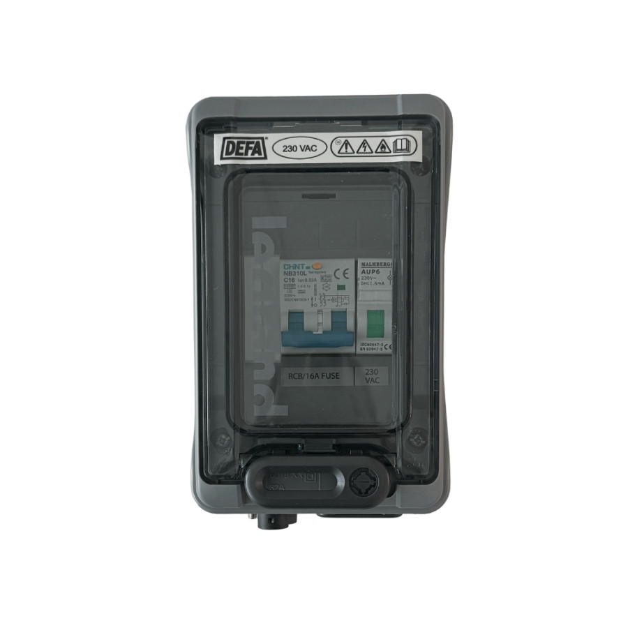 Tableau d’alimentation avec fusible et disjoncteur. Livré par défaut avec une sortie Schuko (prise suédoise standard) et des prises DEFA comme entrée et sortie. Le tableau d’alimentation est conçu pour un fusible de 230 V CA, 16 A. Il contient un « économiseur de zinc » qui réduit la corrosion galvanique des métaux à bord.